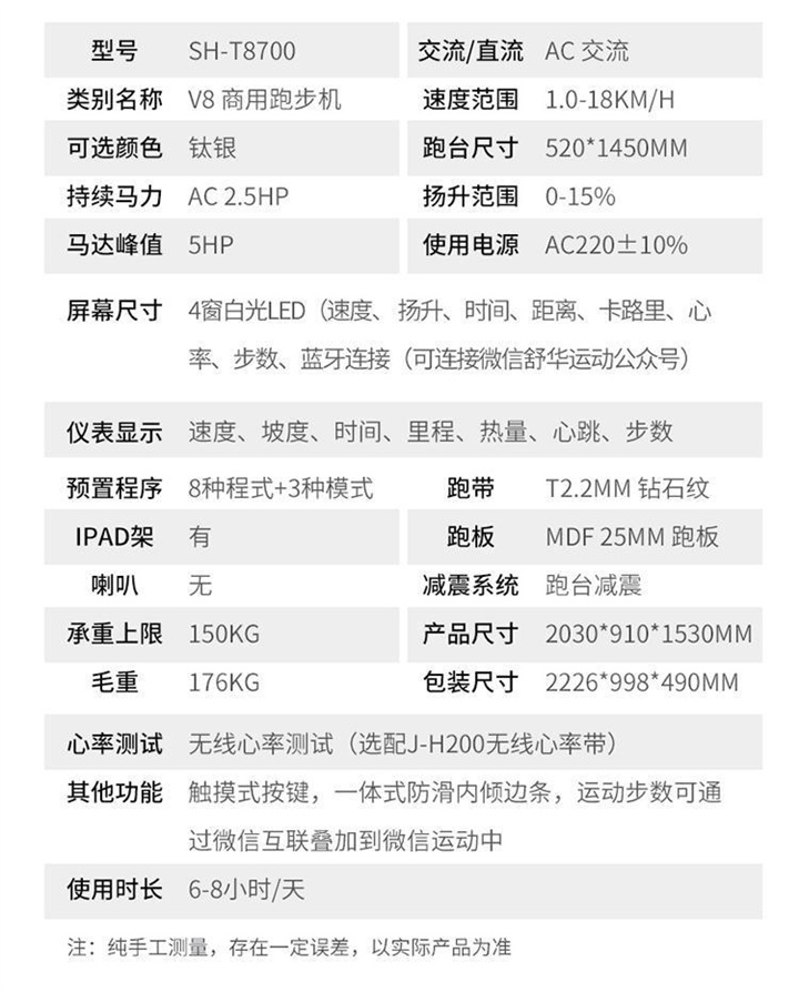 舒華商用跑步機SH-T860(V6)采用商用大跑臺,手握心律測試,全跑臺減震護足的設計,對您跑步中的膝蓋進行全方位的呵護,選用手握式感應片測心率等數(shù)據(jù),跑步面積達580×1570mm,可承受180kg的使用者使用。