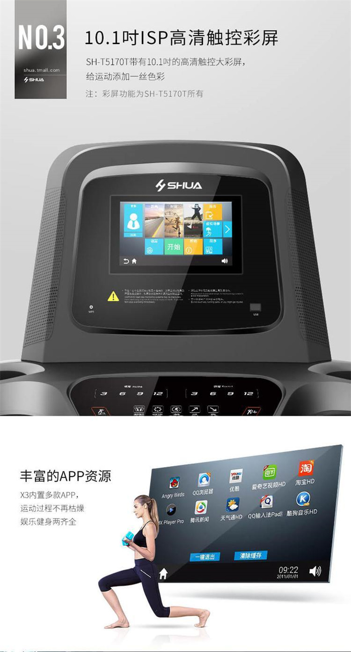 智能商用跑步機SH-T8919T-Y50(V1+)采用T2.2mm黑鉆紋(可選配:T2.4免維護跑帶)的跑帶,選用手握心率測試 自帶心率帶及增加心率控速(HRC)程序模塊測量心跳等數(shù)據(jù),跑步寬度達580mm,可承受180kg的使用者使用。