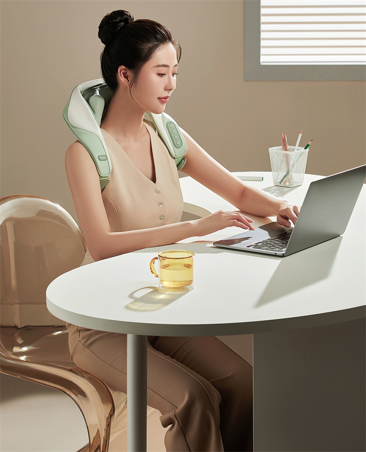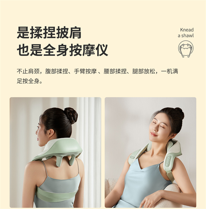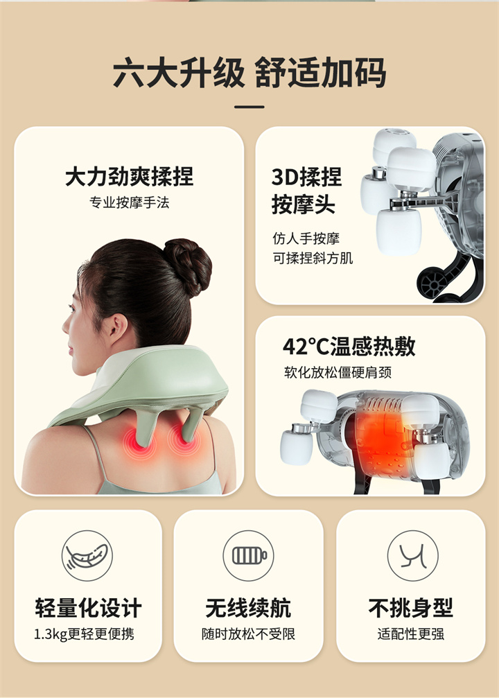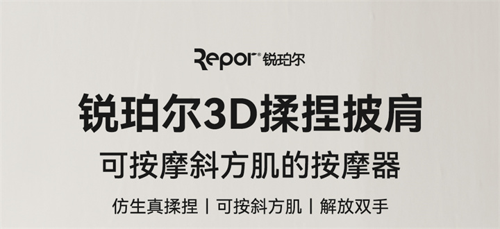 銳珀?duì)?/a>揉捏披肩RP-R7,全新感受,可按摩斜方肌的按摩器,覆蓋肩頸,將中醫(yī)揉捏技術(shù)與數(shù)字化融合,模擬中醫(yī)人手開(kāi)合夾、捏、揉、推等按摩手法,盡情釋放身體疲憊,升級(jí)降噪直流純銅無(wú)刷電機(jī),重量更輕,無(wú)線(xiàn),攜帶更方便,大面積熱敷,熱力柔和滲透舒緩。