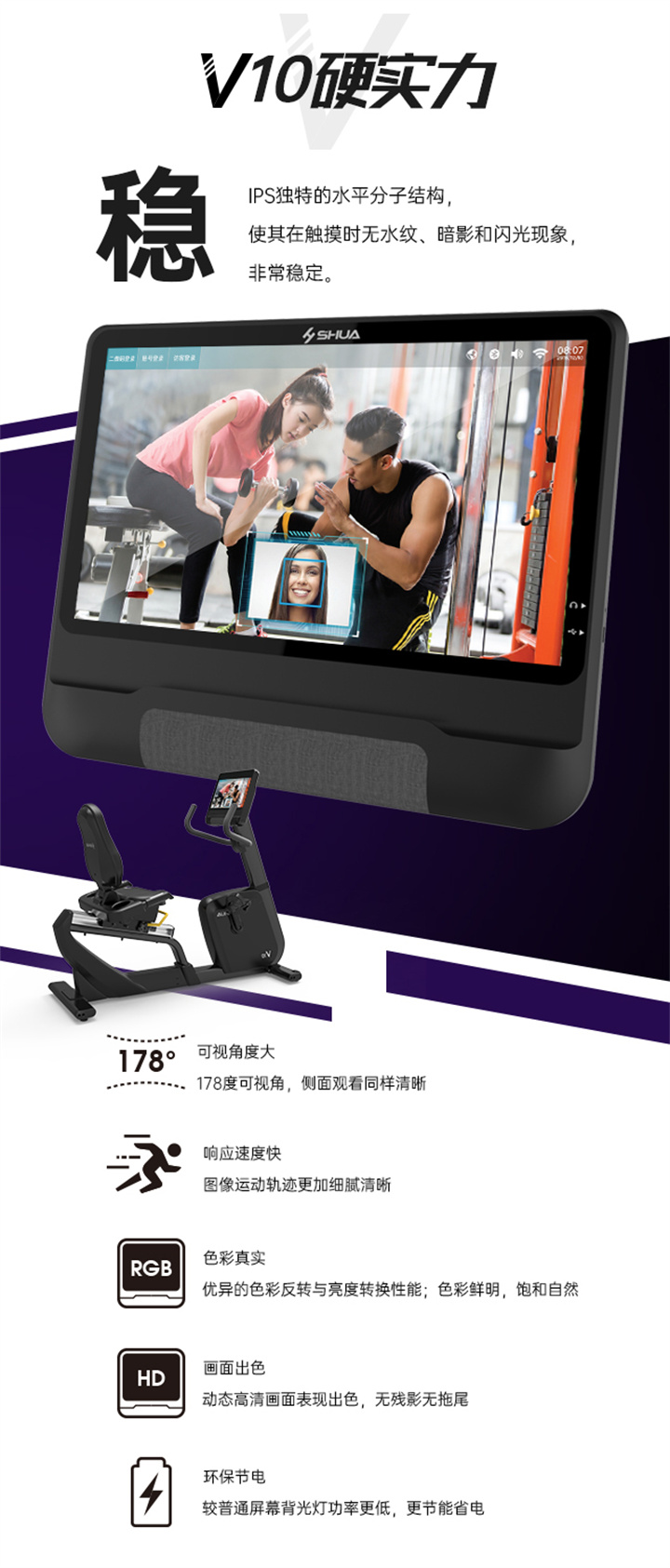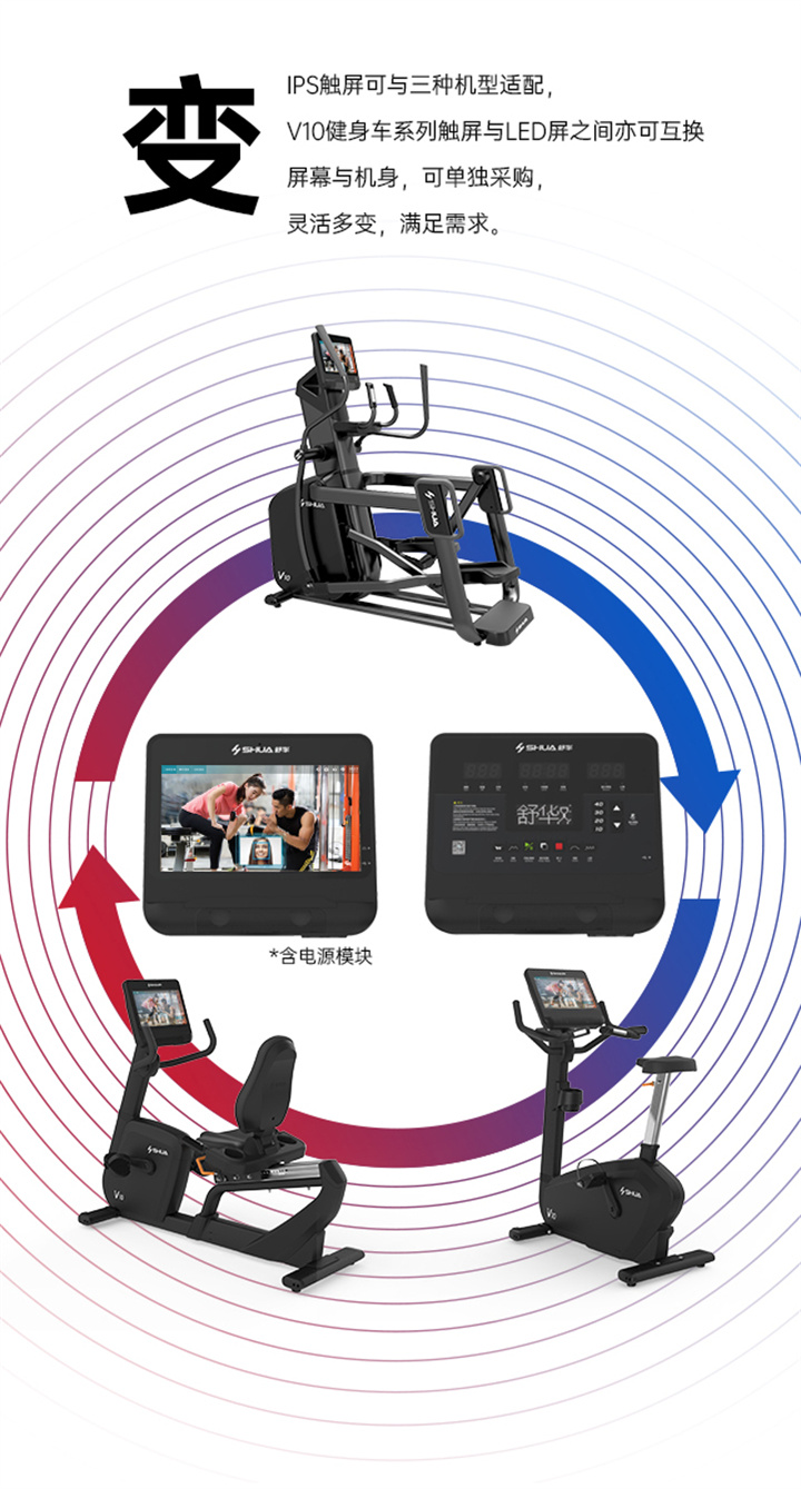 舒華立式商用健身車SH-B9100U(V10)觸屏版擁有超大顯示和操作屏幕, 可以任意設(shè)置阻力、時間和距離等參數(shù),還可以即時顯示心跳和轉(zhuǎn)速等數(shù)據(jù),同時,SH-B9100U提供多項(xiàng)科學(xué)運(yùn)動處方,更輕松掌握運(yùn)動節(jié)奏。