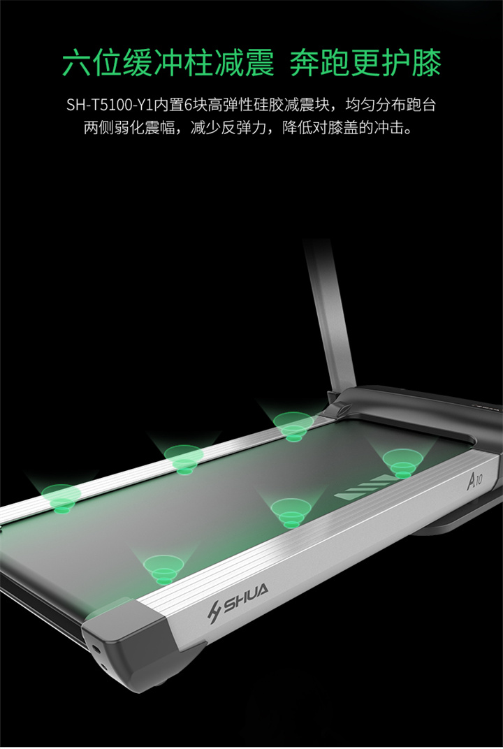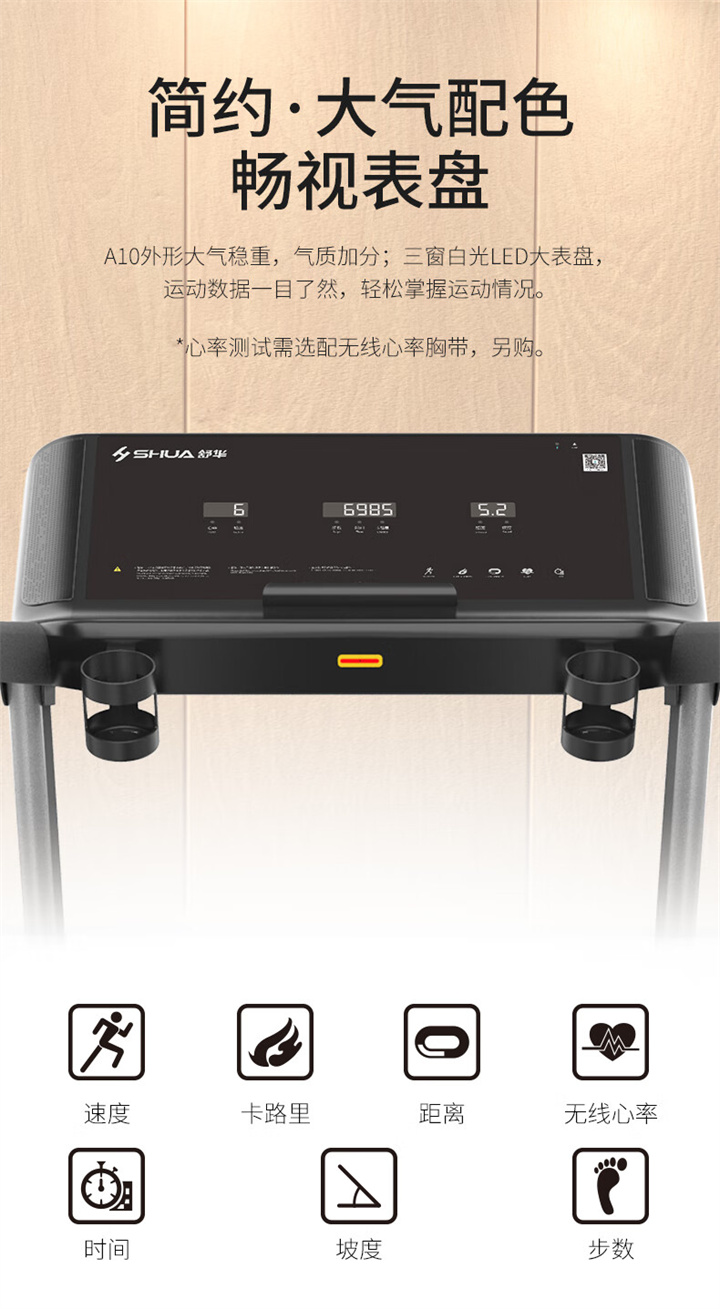 舒華家用跑步機SH-T5100持續(xù)馬力達1.25HP,具有500×1350mm的跑臺,運用無線心率接收模塊監(jiān)測心率,運用6位硅膠減震設計,最大承重是126kg,可以滿足大多數(shù)家庭的使用。