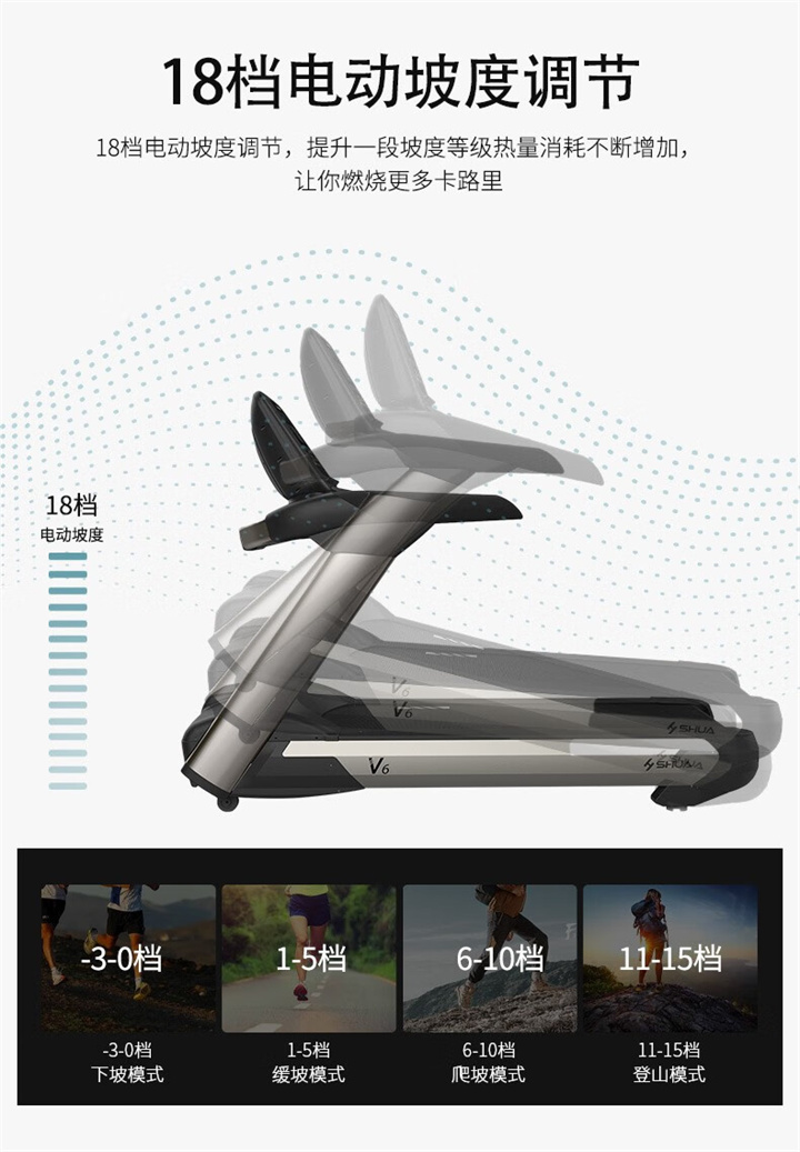 舒華商用跑步機SH-T860(V6)采用商用大跑臺,手握心律測試,全跑臺減震護足的設計,對您跑步中的膝蓋進行全方位的呵護,選用手握式感應片測心率等數(shù)據(jù),跑步面積達580×1570mm,可承受180kg的使用者使用。